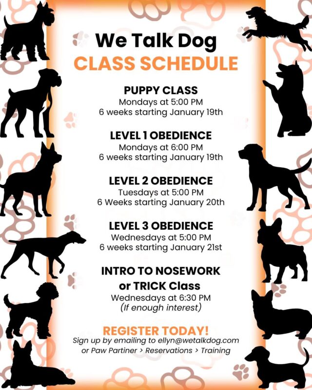 This program includes access to Online course: Training at home, (2) one hour private in-person lessons at We Talk Dog’s Training Center, access to our Facebook group to ask questions and see progress.